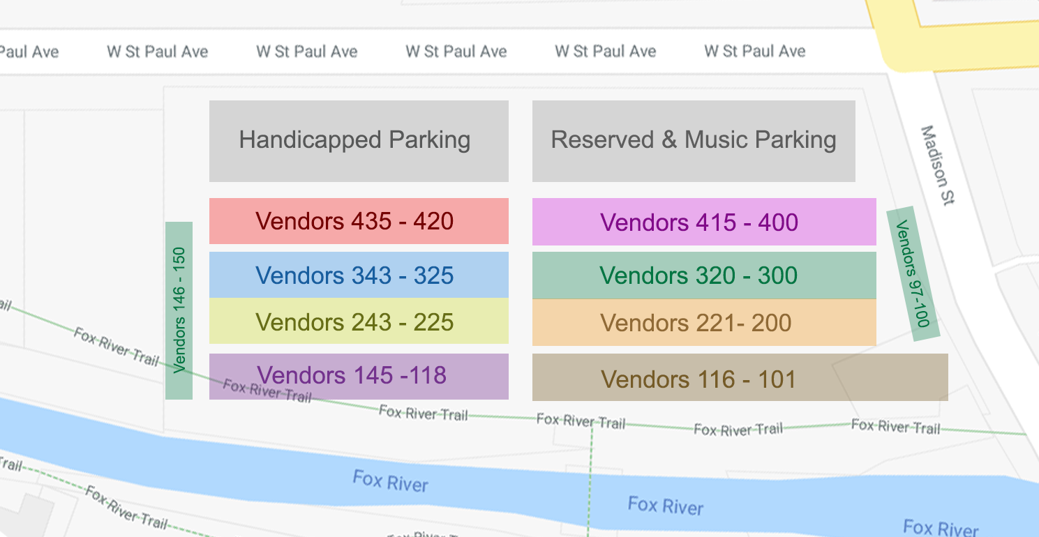 Take a look at the color coded area space below for a view of the Waukesha Farmers' Market site layout.